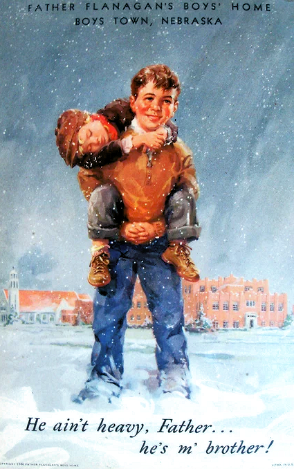 One of the most enduring stories from Boys Town involves a boy named Howard Loomis, who was abandoned by his mother and left at the home. Stricken with polio, Howard wore heavy leg braces that made walking and climbing stairs a grueling task. The older boys at Boys Town took turns carrying him up and down the stairs. One day, Father Flanagan saw a boy struggling to carry Howard. He asked if it was too heavy for him. The boy replied, “He ain’t heavy, Father. . .. he’s m’ brother.” Later, these words were changed to, “He ain’t heavy, Mister . . .. He’s m’ brother.”